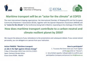 Il 13 dicembre 2019, a Madrid, nell’ambito della UN Climate Change Conference (COP 25) a Madrid, si terrà l’evento dell’industria marittima “Maritime transport will be an “actor for the climate”, organizzato da International Chamber of Shipping (ICS) e European Community Shipowners’ Associations (ECSA), insieme all’Associazione degli Armatori Spagnoli (ANAVE).