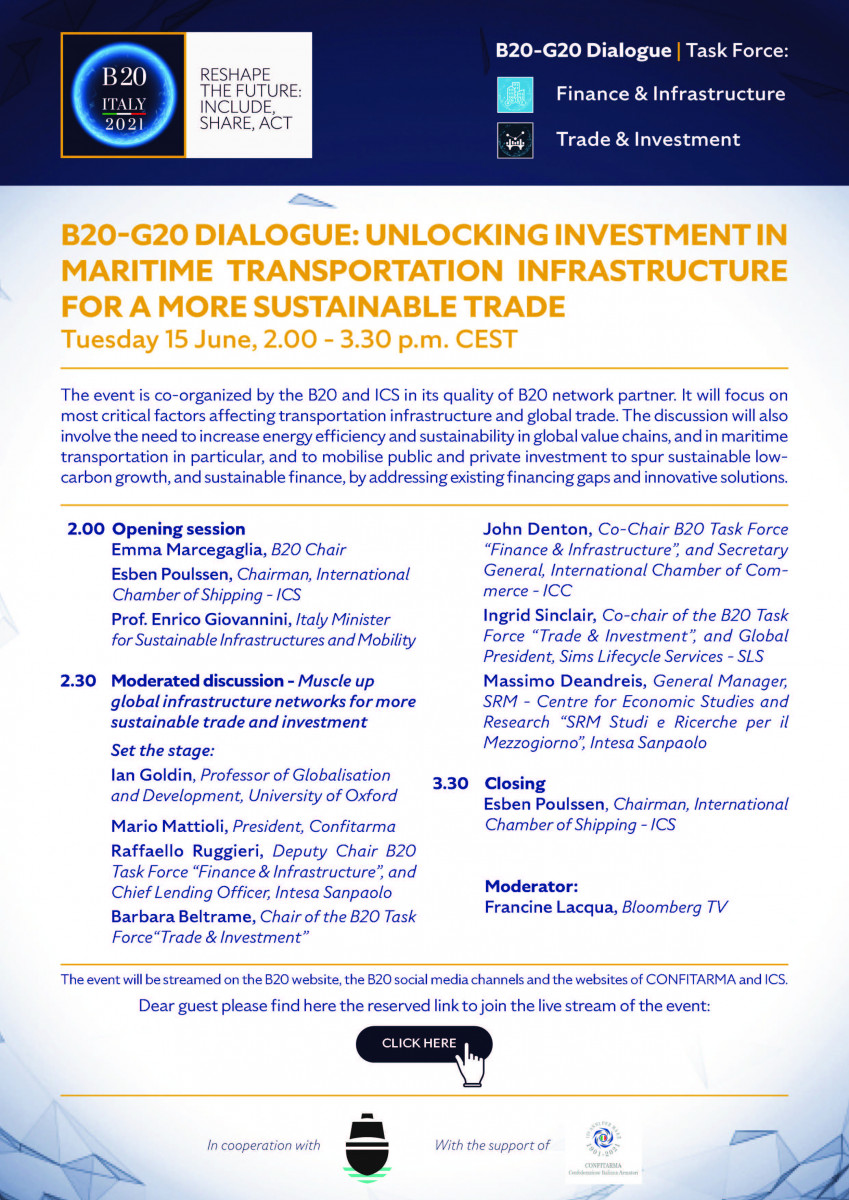 Trasporto marittimo, commercio e sostenibilità al centro del B20-G20 Dialogue organizzato dal B20 insieme a Confitarma e ICS. Il 15 giugno, in video conferenza si è tenuto l’incontro B20-G20 Dialogue “Unlocking investment in maritime transportation infrastructure for a more sustainable trade”, organizzato dal B20 – principale engagement group del G20, guidato da Confindustria insieme a ICS e Confitarma.