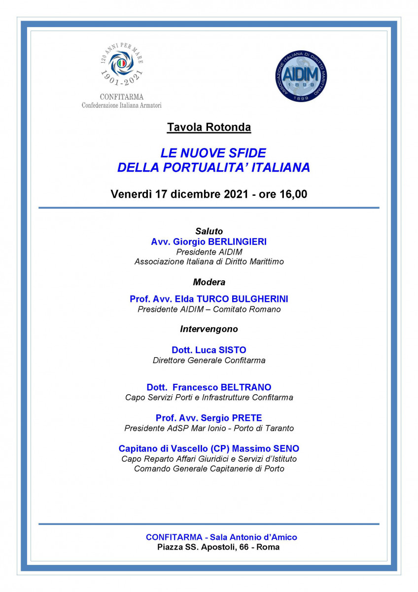 Roma, 17 dicembre 2021 – LE NUOVE SFIDE DELLA PORTUALITA’ ITALIANA Dic 7 , 2021 | Eventi Allegati AIDIM Invito 17.12.2021 Le nuove sfide della portualità italiana
