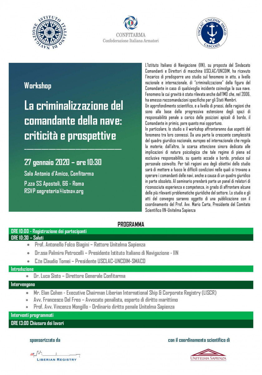 Roma, 27 gennaio 2020. Presso la sede di Confitarma, si è tenuto il workshop “La criminalizzazione del comandante della nave: criticità e prospettive”, organizzato dall’Istituto Italiano di Navigazione (IIN), su proposta del Sindacato Comandanti e Direttori di macchina USCLAC/UNCDIM, in vista dello studio sul fenomeno che da qualche tempo vede a livello nazionale e internazionale, la progressiva estensione degli spazi di responsabilità penale a carico delle posizioni apicali di bordo, il Comandante in primis, studio che verrà realizzato con il coordinamento scientifico dell’Unitelma – Sapienza.