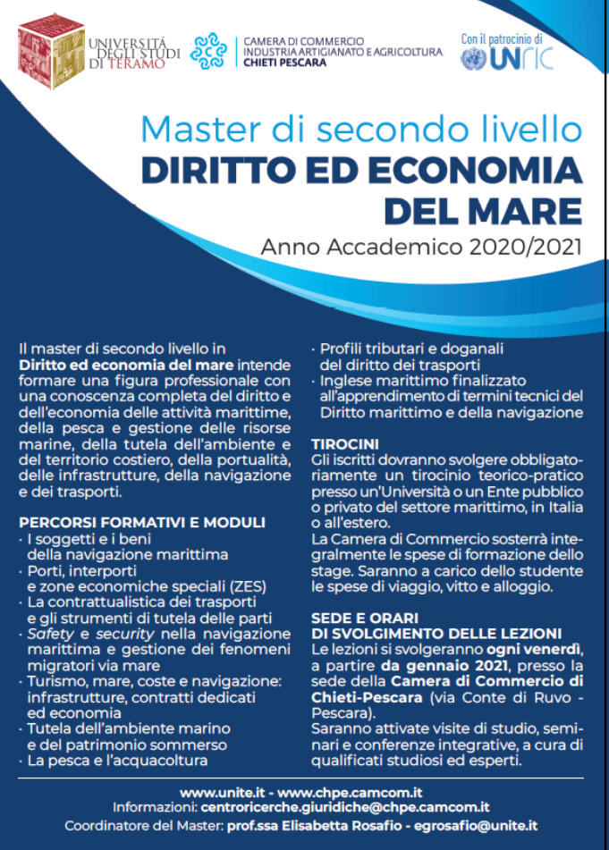 Presso la Facoltà di Giurisprudenza dell’Università degli Studi di Teramo, si terrà la 29^ edizione del Master di II livello in “DIRITTO ED ECONOMIA DEL MARE”, anno accademico 2020/2021.