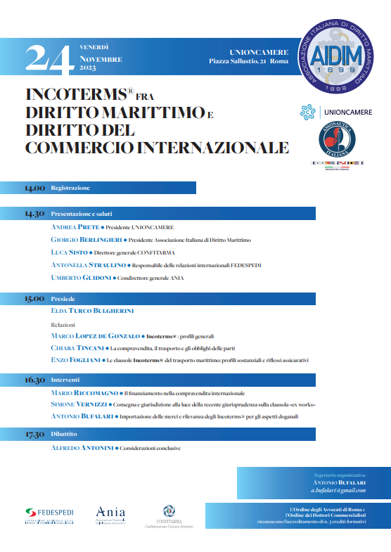 Convegno AIDIM “”Incoterms® fra diritto marittimo e diritto del commercio internazionale” – Roma, 24 novembre 2023 Nov 9 , 2023 | Eventi Allegati AIDIM - Locandina Evento Diritto Marittimo e Commerciale Internazionale