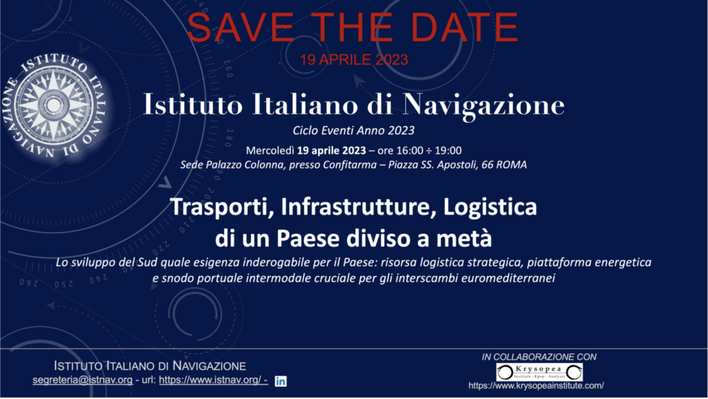 Il 19 aprile 2023 (14:00-19:00), l’Istituto Italiano di Navigazione nella propria sede presso Confitarma (sala Antonio d’Amico), Piazza SS. Apostoli 66, Roma, in collaborazione con l’Istituto Krysopea, ha in programma un Convegno sul tema dei trasporti, della logistica e dello sviluppo territoriale del Paese, con particolare riferimento alle aree del Mezzogiorno d’Italia più critiche.