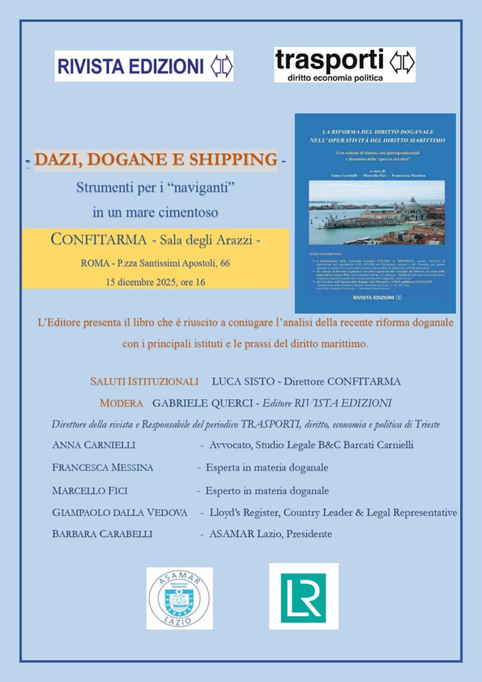 “Dazi, Dogane e Shipping”. Dialogo con gli Autori del libro: “La riforma del diritto doganale nell’operatività del diritto marittimo” Dic 12 , 2025 | Landing Page evento Allegati DAZI, DOGANE E SHIPPING copertina