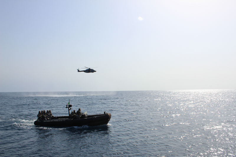 La fregata “Luigi Rizzo” – da giorni impegnata nell’area del Golfo di Guinea in un’operazione di presenza e sorveglianza per contribuire alla libertà di navigazione, alla sicurezza e alla protezione dei mercantili lungo le principali linee di comunicazione marittima (Sea Lines Of Communication SLOC) – come avverrebbe nella realtà, appena ricevute le disposizioni operative da parte del Comando in Capo della Squadra Navale, ha rapidamente serrato le distanze e, in vista della “Grande Dakar”, ha disposto il decollo del proprio elicottero e messo a mare i propri gommoni veloci con il team di sicurezza composto dai Fucilieri della Brigata Marina San Marco per il successivo abbordaggio a protezione della nave.