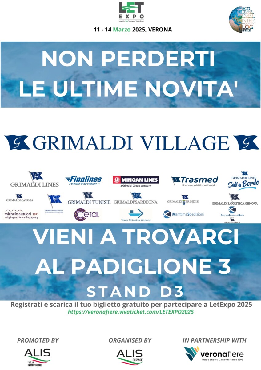 Napoli, 3 marzo 2025 – Anche quest’anno il Gruppo Grimaldi sarà tra i protagonisti di LetExpo – Logistics Eco Transport Trade Show, la fiera dedicata alla logistica sostenibile, ai trasporti e ai servizi alle imprese che si terrà dall’11 al 14 marzo presso il polo fieristico Veronafiere di Verona.
