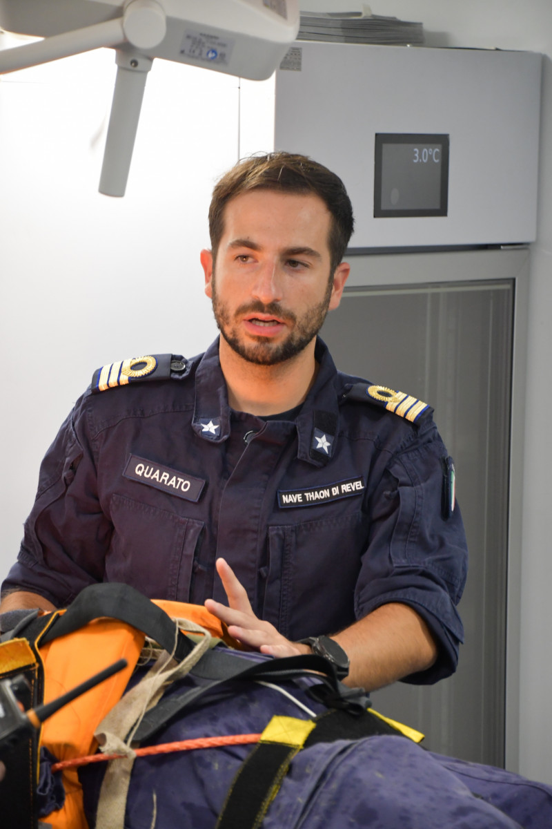 During the exercise off the coast of Kuwait, a medical evacuation from the tug to a nearby hospital was simulated. In this scenario, a seafarer onboard the tug needed immediate medical assistance, and the nearby navigating Italian warship was informed by Italian Navy Fleet Hq (CINCNAV) about the urgent situation. The Thaon di Revel deployed her SH-90 helicopter with a medical team towards Saraceno Primo. A naval doctor was winched onto the deck of the tug to assist the sailor. Assessing the severity of the injuries, it was decided to evacuate the patient with the helicopter to the nearest hospital in the region in coordination with the local Maritime Rescue Coordination Centre (MRCC).