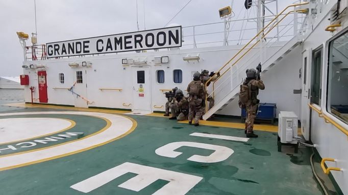 In uno scenario particolarmente realistico, a largo delle coste ivoriane, è stato simulato un tentativo di attacco alla M/V GRANDE CAMEROON del Gruppo Grimaldi da parte di un gruppo di pirati a bordo di una piccola imbarcazione (skiff), a seguito del quale è stata avviata, attraverso l’attivazione a bordo del previsto segnale di allarme (SSAS) ricevuto dalla IMRCC della Guardia Costiera in qualità di National Competent Authority per la Ship Security, la sequenza di allarme nazionale attivando CINCNAV e quindi l’intervento della FREMM.