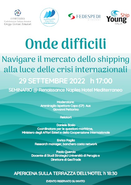 Il 29 settembre 2022 nell’ambito delle manifestazioni della Naples Shipping Week, presso il Renaissance Naples Hotel Mediterraneo, il Gruppo Giovani Armatori di Confitarma insieme al Gruppo Giovani di Federagenti, Fedespedi Giovani e YoungShip Italia ha organizzato il seminario “Onde difficili. Navigare il mercato dello shipping alla luce delle crisi internazionali”.