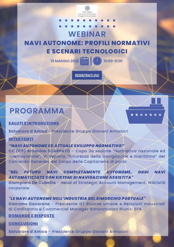 Il 31 maggio Salvatore d’Amico Presidente del Gruppo Giovani Armatori di Confitarma aprirà i lavori del webinar Navi Autonome: Profili Normativi e Scenari Tecnologici, seguiranno gli interventi di: