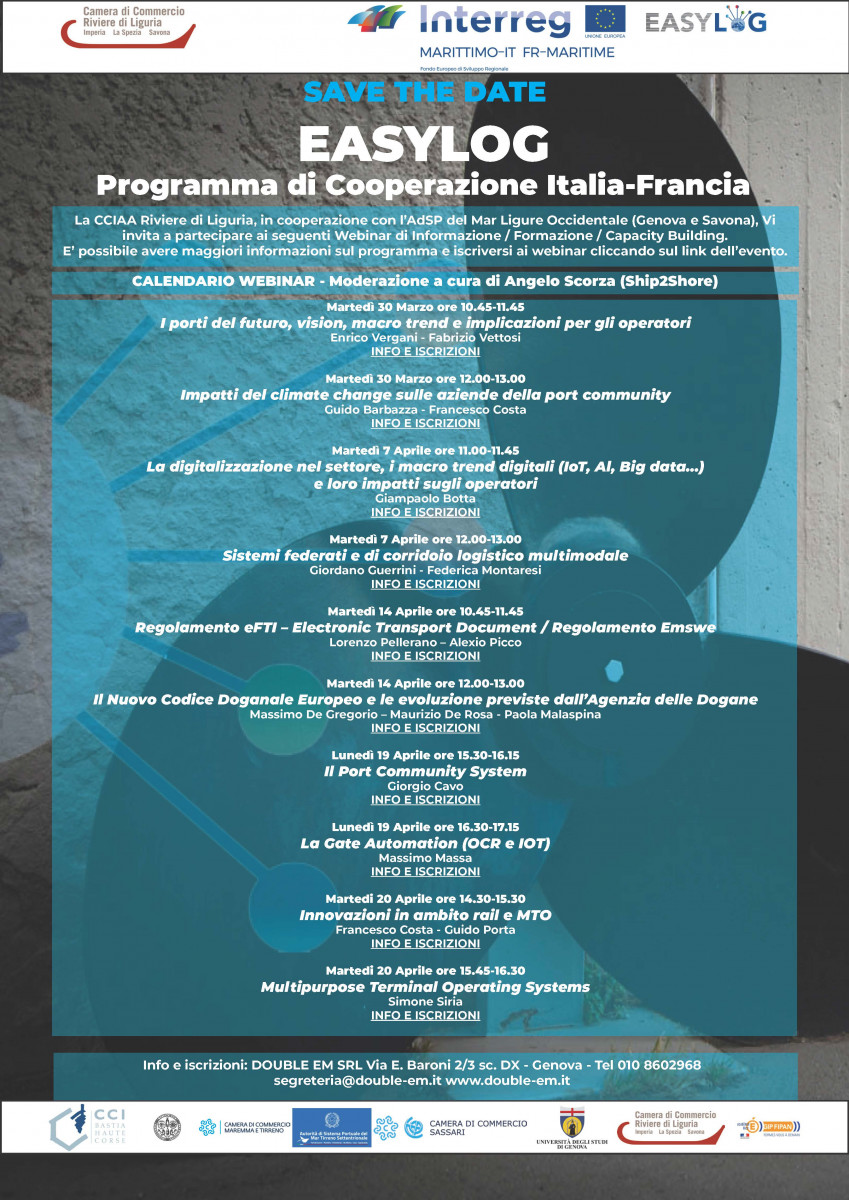 Nell’ambito del progetto EasyLog INTER-REGIONALE MARITTIMO ITALIA FRANCIA, la CCIAA Riviere di Liguria, in cooperazione con l’AdSP del Mar Ligure Occidentale (Genova e Savona), organizza una serie di eventi dal 30 marzo al 20 aprile 2021.