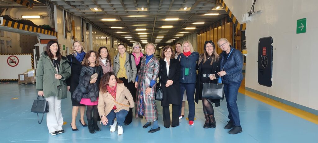 Per pranzo la delegazione di Wista Italy si è spostata al terminal Forship dove ad accoglierli c’erano l’amministratore delegato Giuseppe Scognamiglio, la responsabile marketing e comunicazione Cristina Pizzutti e il chief sales officer, Sebastian Romani insieme ad altri colleghi. In un clima di grande convivialità, condiviso anche con la sindaca di Vado Monica Giuliano , la delegazione Wista ha potuto visitare anche la nave “Mega Smeralda” di Corsica Ferries, appena arrivata dai lavori di bacino dove, sul Ponte di Comando, la presidente di Wista Italy , Costanza Musso, ha consegnato il Crest al Comandante.